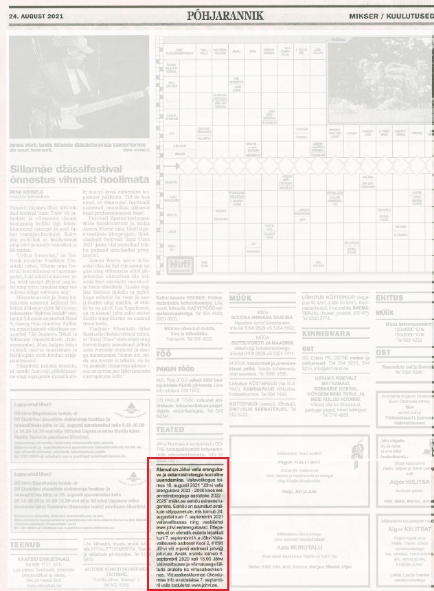 Avalik arutelu toimus 18. juulil Jõhvi Vallavalitsuses koos võimalusega lülituda arutelule ka virtuaalkeskkonnas Teams.