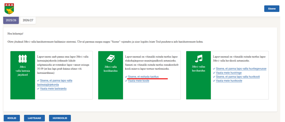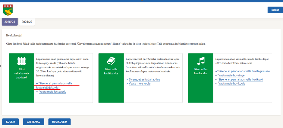 2. Valige avalehelt link „Sisene, et panna laps valla lasteaiajärjekorda“.