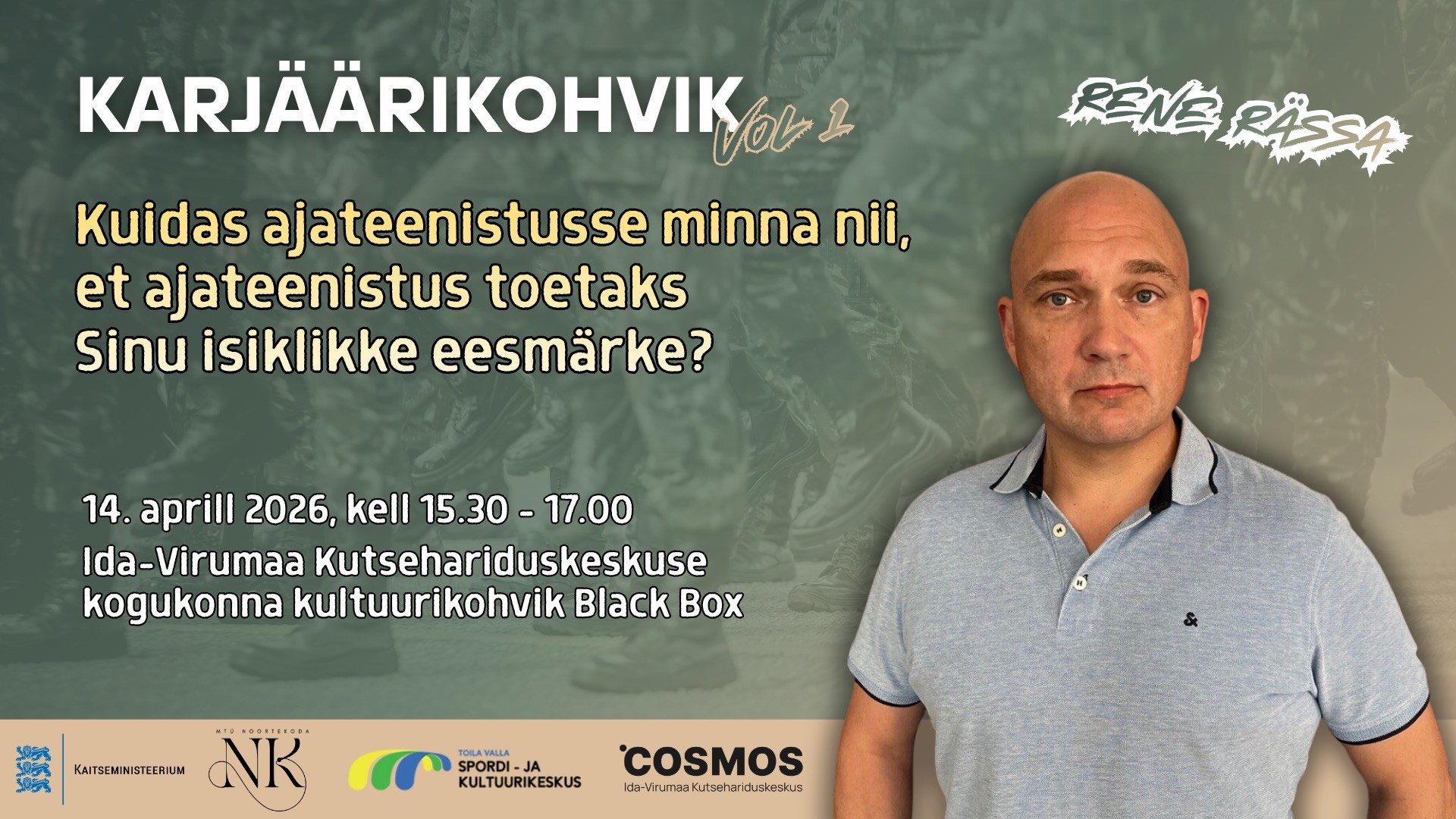 Kutsume 13-19 aastaseid noori osalema kohvikustiilis arutelusarja esimesel kohtumisel, kus külaliseks on Rene Rässa – Kaitseressursside ameti noortepoliitika valdkonnajuht ja riigikaitse õpetaja.