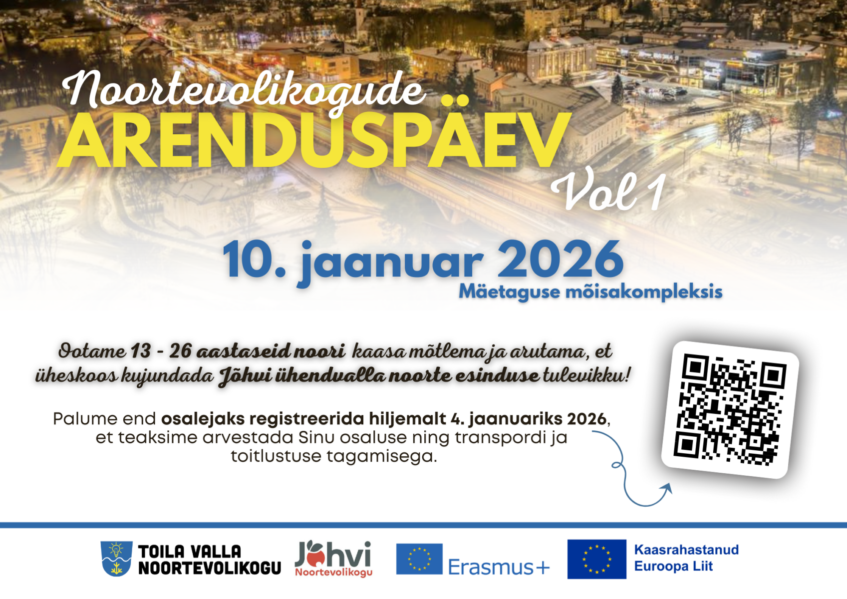 Toila valla noorte osalusprojekti „Täna noor, homme otsustaja“ raames viiakse läbi kolm arenduspäeva, kuhu on oodatud KÕIK Jõhvi ja Toila piirkonna 13 – 26 aastased noored, kes soovivad panustada uue omavalitsuse noorte esindusstruktuuri kujundamisse!