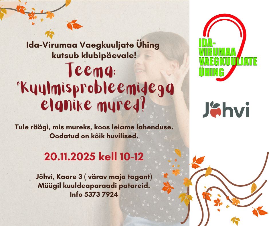 Ida-Virumaa Vaegkuuljate ühing kutsub teabepäevale “Kuulmisprobleemidegta elanike mured”. Tule räägi, mis mureks, koos leiame lahenduse. Oodatud kõik huvilised.