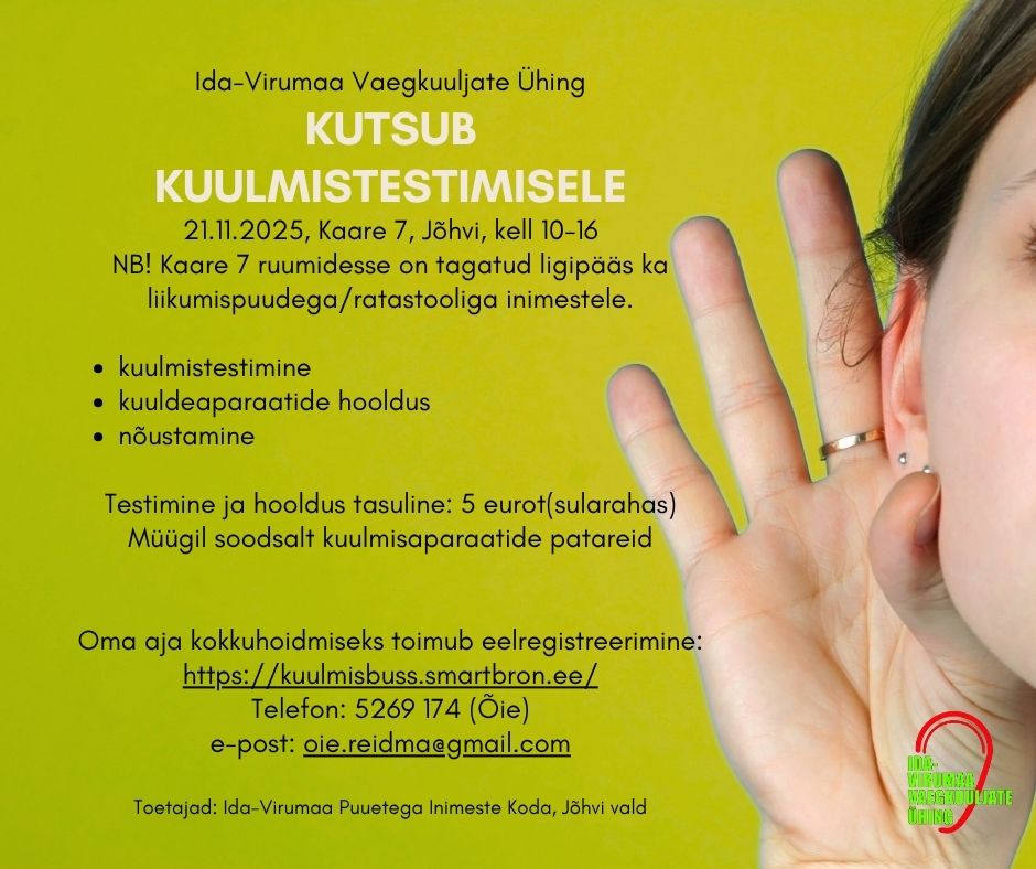 Ida-Virumaa Vaegkuuljate ühing kutsub kuulmistestimisele. Kuulmistestimine Kuuldeaparaatide hooldus Nõustamine Testimine ja hooldus on tasuline: 5 eurot (sularahas) Müügil soodsalt kuulmisaparaatide patareid. Eelregistreerimine: https://kuulmisbuss.smartbron.ee/ 526 1974 (Õie) oie.reidma@gmail.com