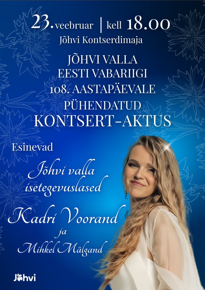Olete oodatud Eesti Vabariigi 108. aastapäevale pühendatud kontsert-aktusele. Esinevad Jõhvi valla isetegevuslased ning Kadri Voorand ja Mihkel Mälgand. Tähistame koos pidulikult ja muusika saatel Eesti Vabariigi sünnipäeva.