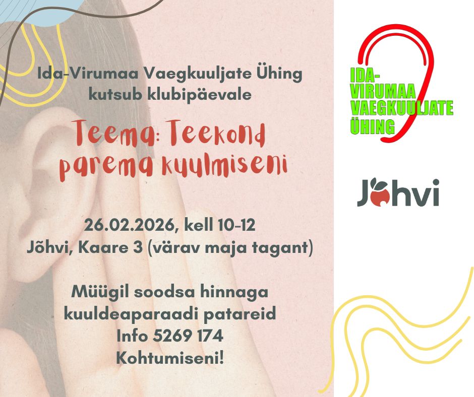 Teema: Teekond parema kuulmiseni 26.02.2026, kell 10-12 Jõhvi, Kaare 3 (värav maja tagant) Müügil soodsa hinnaga kuuldeaparaadi patareid Info 5269 174