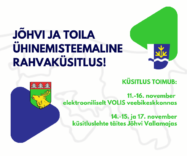 Jõhvi Vallavalitsus korraldab novembri keskel rahvaküsitluse, et selgitada välja Jõhvi valla elanike arvamus Jõhvi ja Toila valla ühinemise kohta. Küsitlusele saab vastata nii elektrooniliselt kui ka paberil. Elektrooniline küsitlus algab veebikeskkonnas VOLIS 11. novembril 2024 kell 00.01 ja lõpeb 16. novembril 2024 kell 20.00 (link avatakse kodulehel).