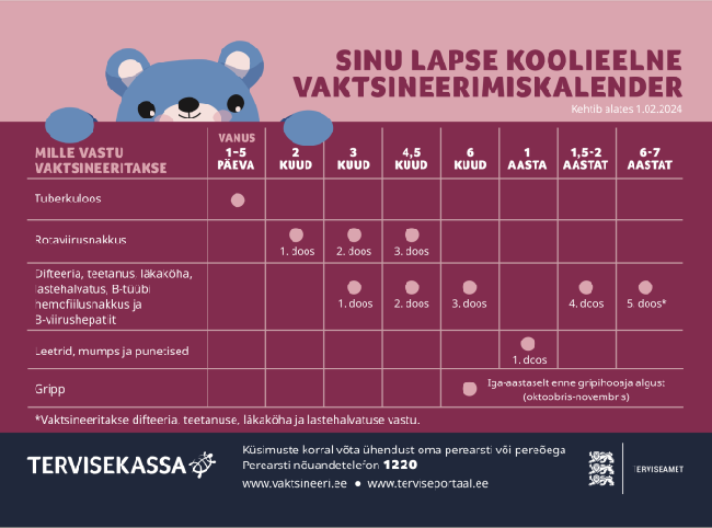 Tervisekassa, Terviseamet ja Eesti Perearstide Selts tuletavad lapsevanematele meelde, et kooli alguses tuleks vaadata üle ka lapse vaktsineerimise seis. Lapse koolieelne vaktsineerimiskalender sisaldab kaitset 12 nakkushaiguse vastu.