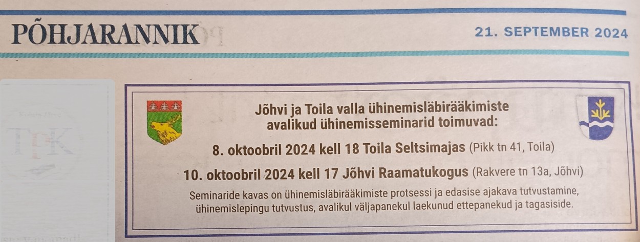 - “Jõhvi ja Toila valla ühinemisläbirääkimiste avalikud seminarid” (27.09.2024)