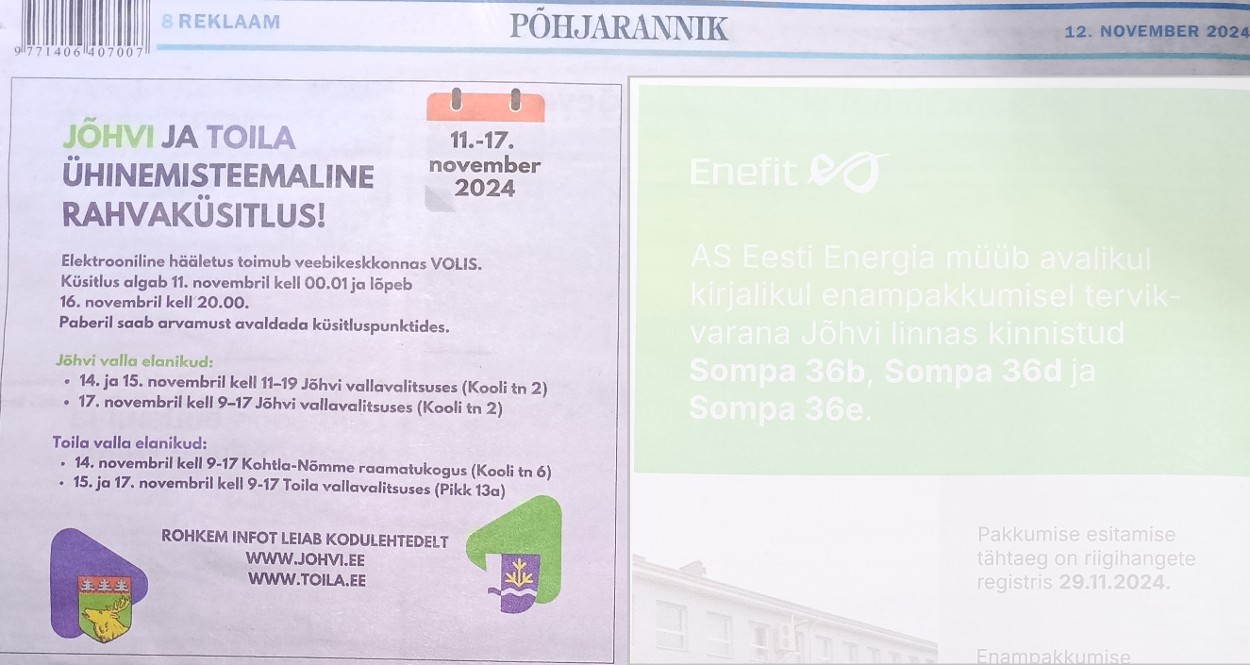 Rahvaküsitluse kuulutus ajalehes “Jõhvi Teataja” (5.11.2024); “Põhjarannik” (12.11.2024).